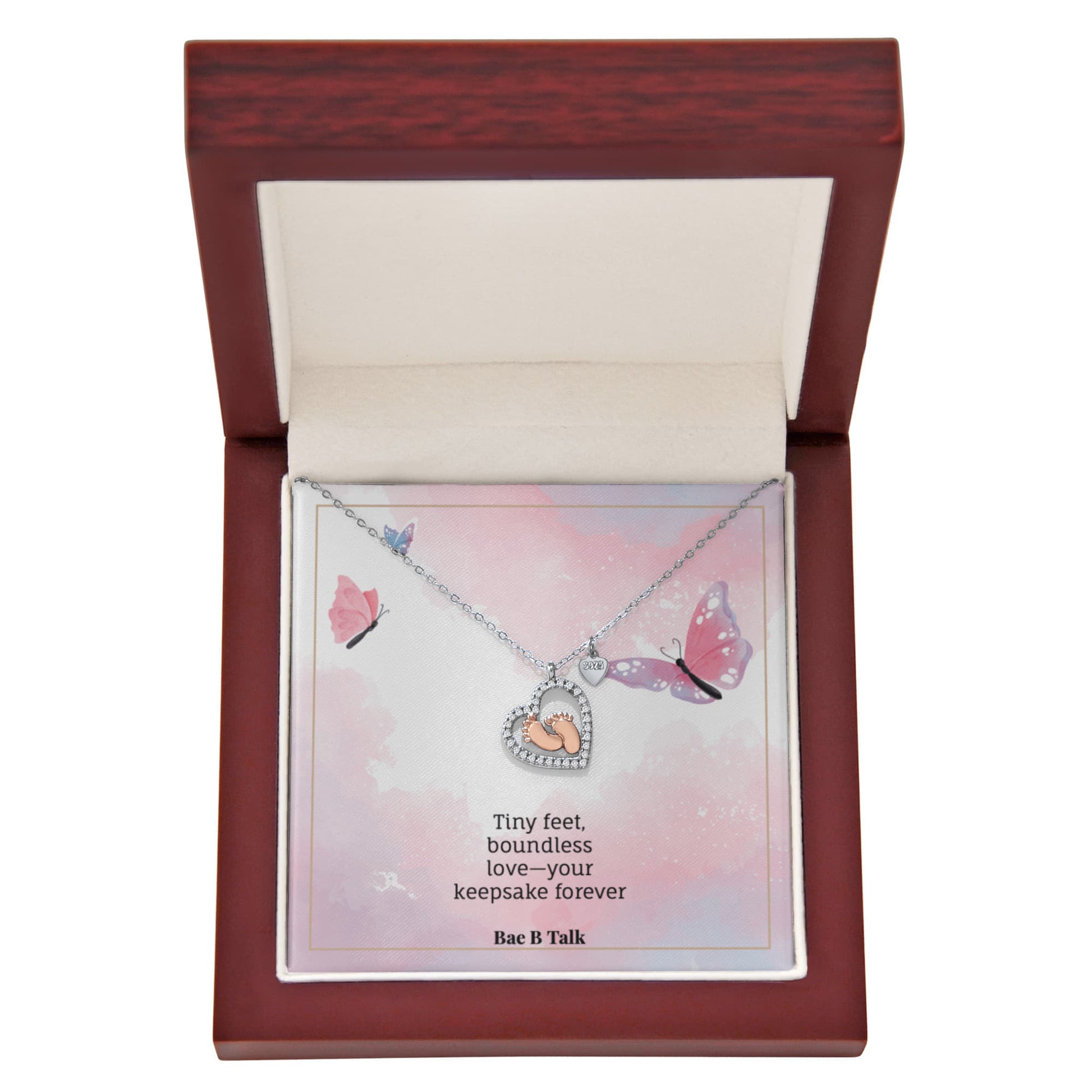 Imagine her reaction receiving this heartfelt symbol of love, family, and precious beginnings. The Baby Feet Heart Necklace features a sparkling heart-shaped frame adorned with shimmering cubic zirconia, surrounding a delicate pair of rose gold baby feet. A touching tribute to motherhood and new life, this necklace is the perfect way to celebrate a new mom, a cherished child, or a growing family.